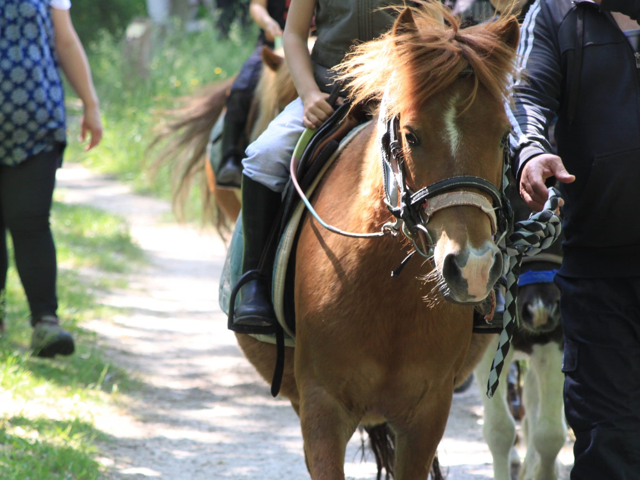 Les shetlands (poney de petit taille) accueillent les plus jeunes enfants, les doubles poneys de tailles différentes permettent de faire passer les cavaliers à cheval, tout en douceur